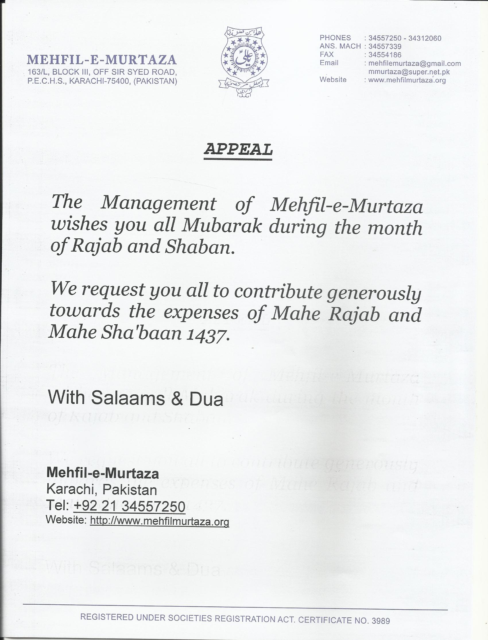 APPEAL FOR RAJAB & SHABAN 1437 -2016 CONTRIBUTION
