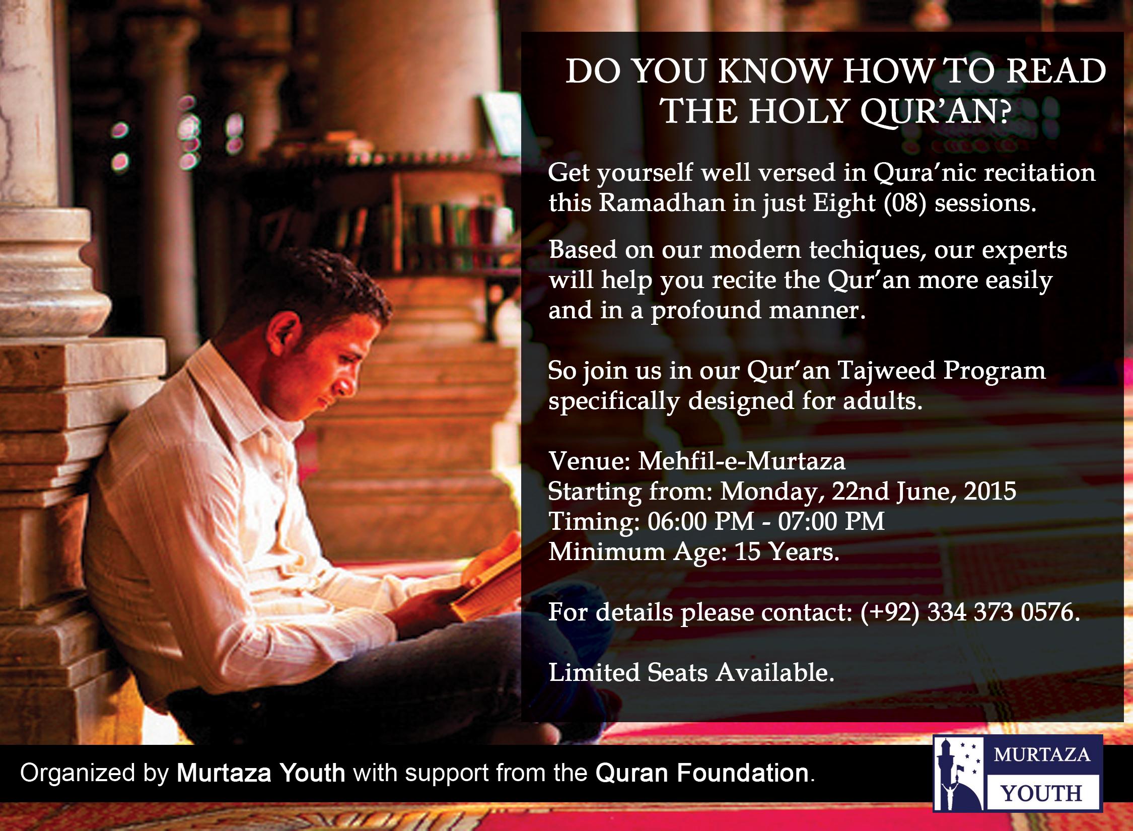 قرآن تجوید پروگرام براے جوان و بزرگ – کمز کم عمر: ١٥سال